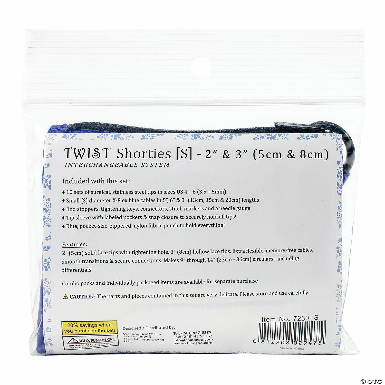 With the Blue Shorties set you can make 9 inch through 14 inch circulars. This 5×4 inch package contains ten sets of surgical, stainless steel tips in sizes US 4-8 (3.5-5mm), small diameters X- Flex blue cables in 5 inch, 6 inch and 8 inch lengths, ed stoppers, tightening keys, connectors, stitch markers, needle gauge, tip sleeve with labeled pockets & snap closure to securely hold all tips and one pocket-size, zippered, nylon fabric pouch. Imported. Special Shipping Information: This item ships separately from other items in your order. This item cannot ship to a P.O. Box. This item may be subject to additional processing days. ITEM IS NOT ELIGIBLE FOR EXPEDITED SHIPPING