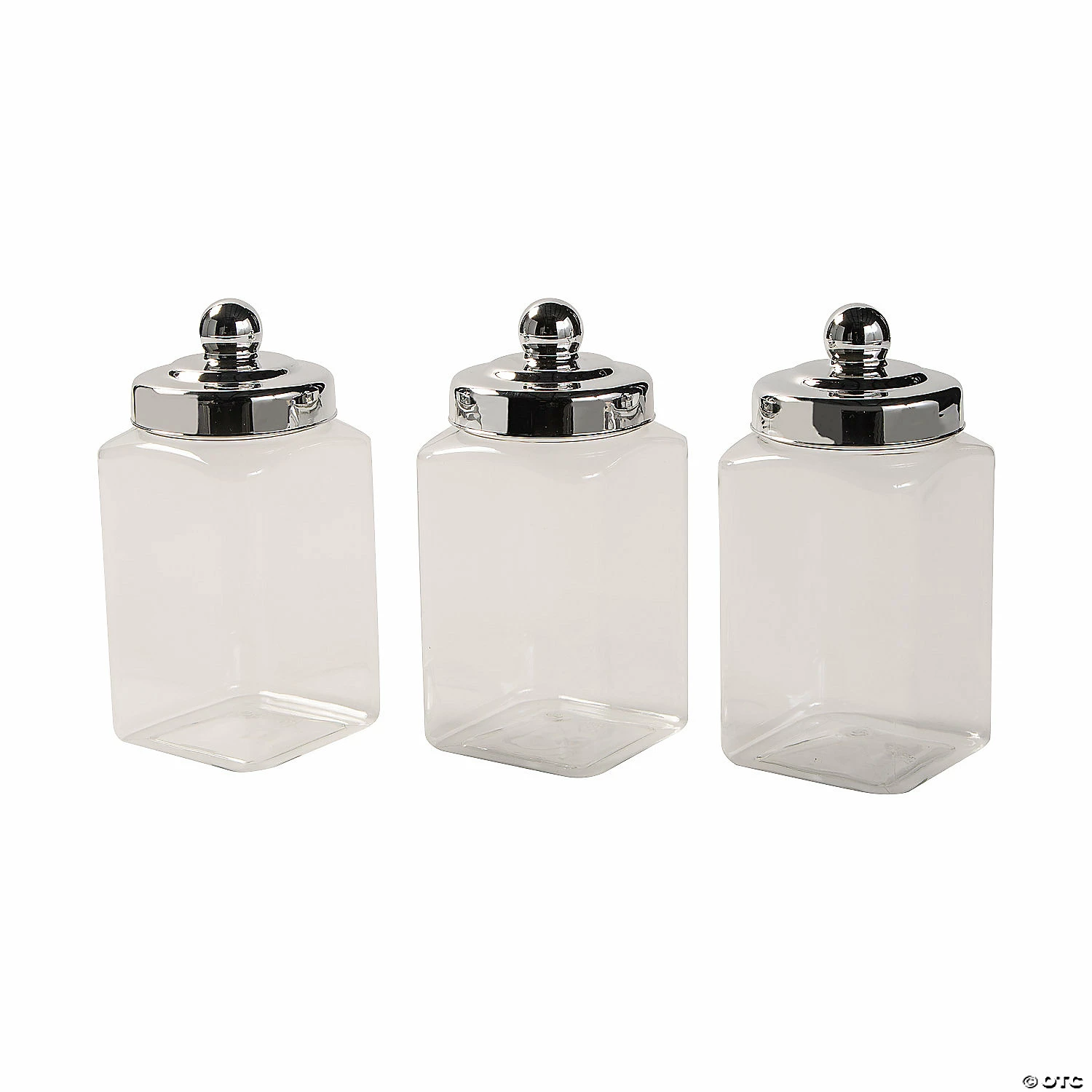 These versatile storage jars are perfect for just about anything! From home décor displays, to serveware in the kitchen or at a party, storing stationery supplies like paper clips or craft supplies, the possibilities are truly endless! Plastic. (3 pcs. per unit) 4″ x 4″ x 8″