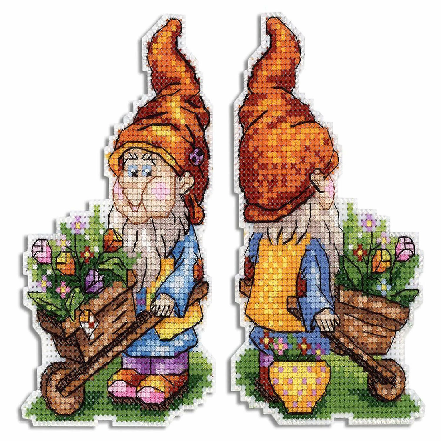 Cute Easter dwarf with trolley of tulips and long orange hat on the plastic canvas. Kit makes 1 double sided dwarf stitched together or front and back of the design separately. This interesting spring kit will enhance your plastic canvas collection.
