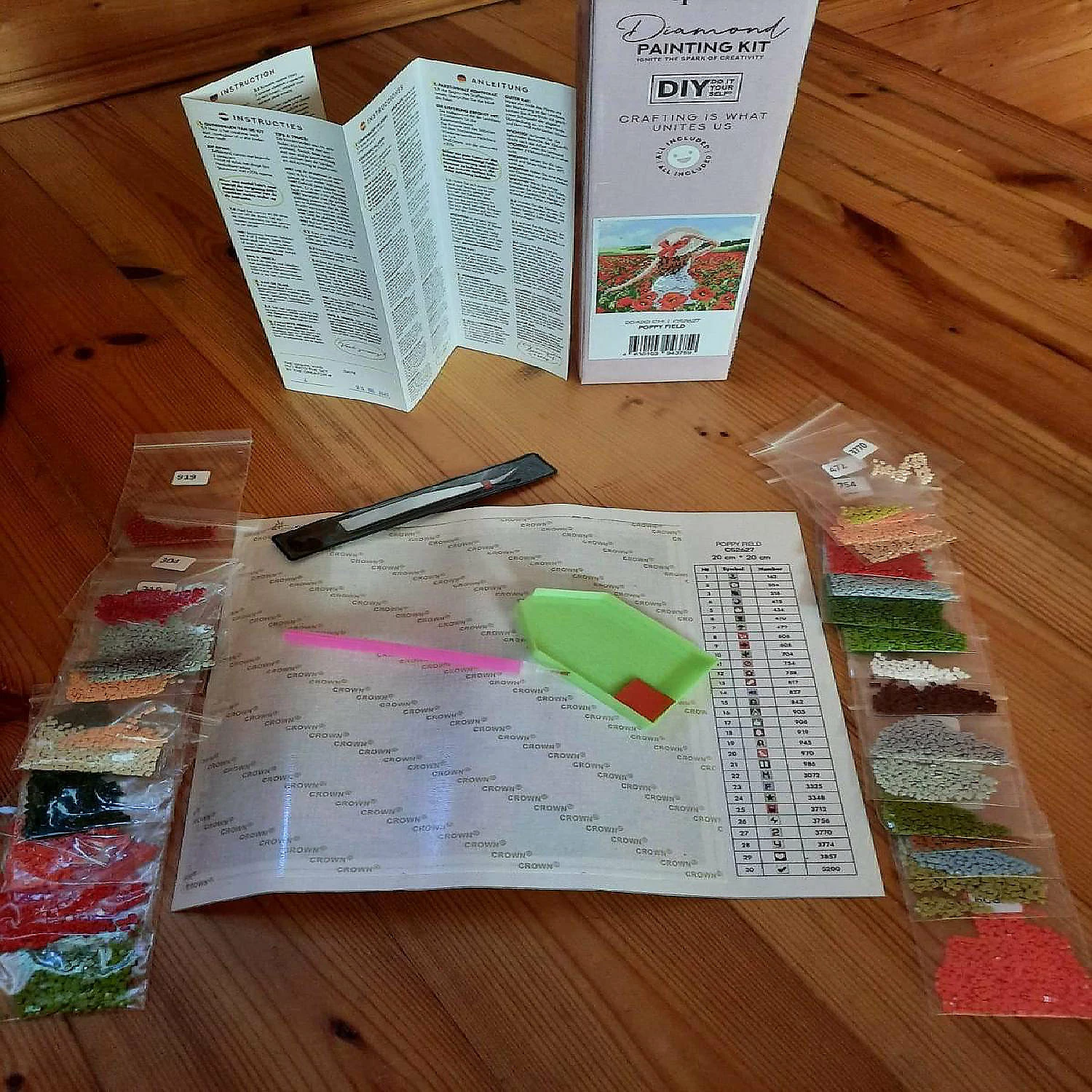 The diamond painting kit Crafting Spark contains: high quality self-adhesive canvas with printed detailed design chart; tweezers, stylus, dry glue pad and two craft trays; reusable zip lock bags with pre-sorted square acrylic diamonds in extra quantity.