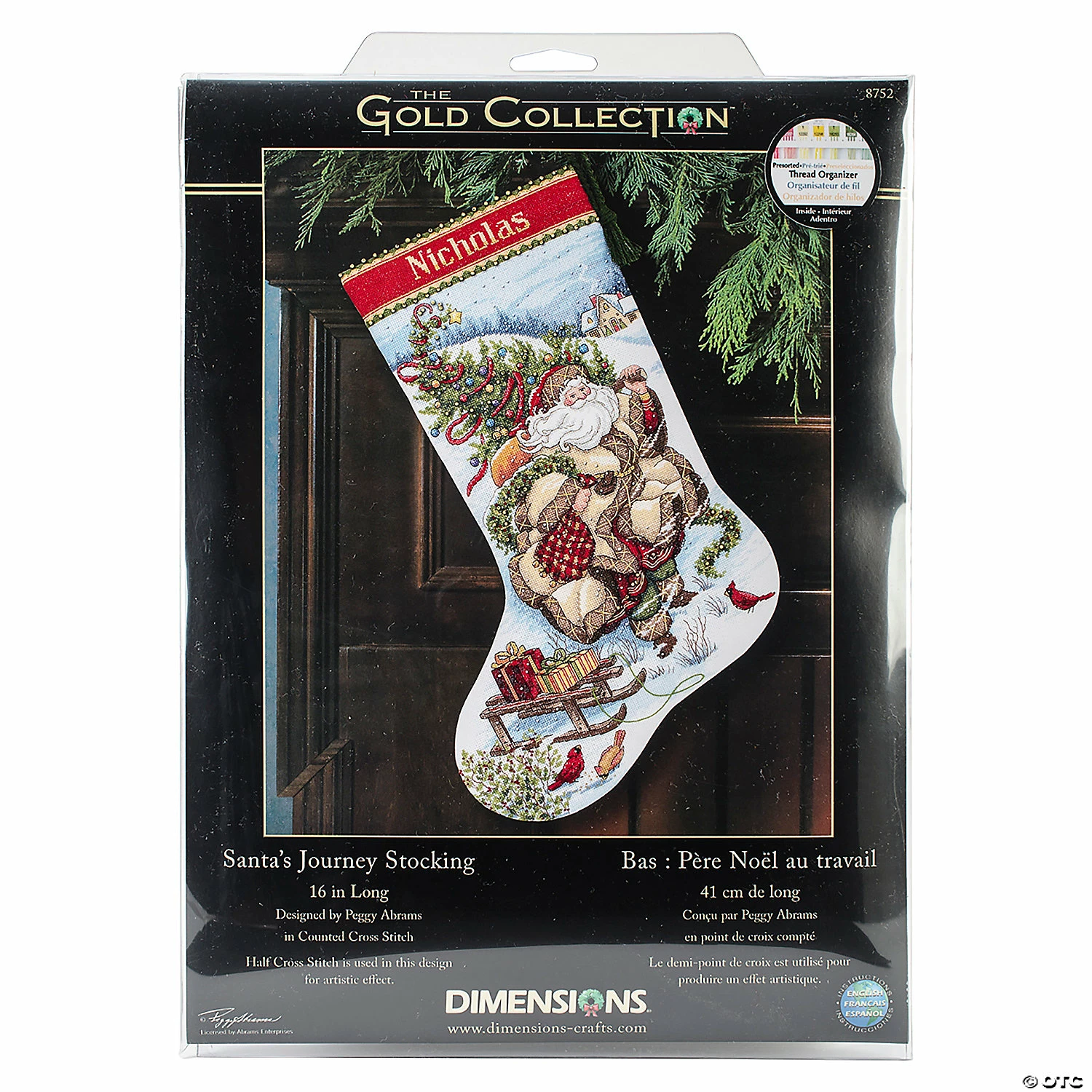 DIMENSIONS-The Gold Collection: Counted Cross Stitch. The Gold Collection Kits are wonderfully detailed with full and half cross stitches. Kit includes: 18 count white Aida, wool and acrylic yarn, cotton and metallic thread, thread sorted, beads, felt (for backing), needle, and easy to follow instructions with an alphabet for personalization. Finished size: 16 inches long. Design: Santa’s Journey Stocking. Designer: Peggy Abrams. Imported. Special Shipping Information: This item ships separately from other items in your order. This item cannot ship to a P.O. Box. This item may be subject to additional processing days. ITEM IS NOT ELIGIBLE FOR EXPEDITED SHIPPING