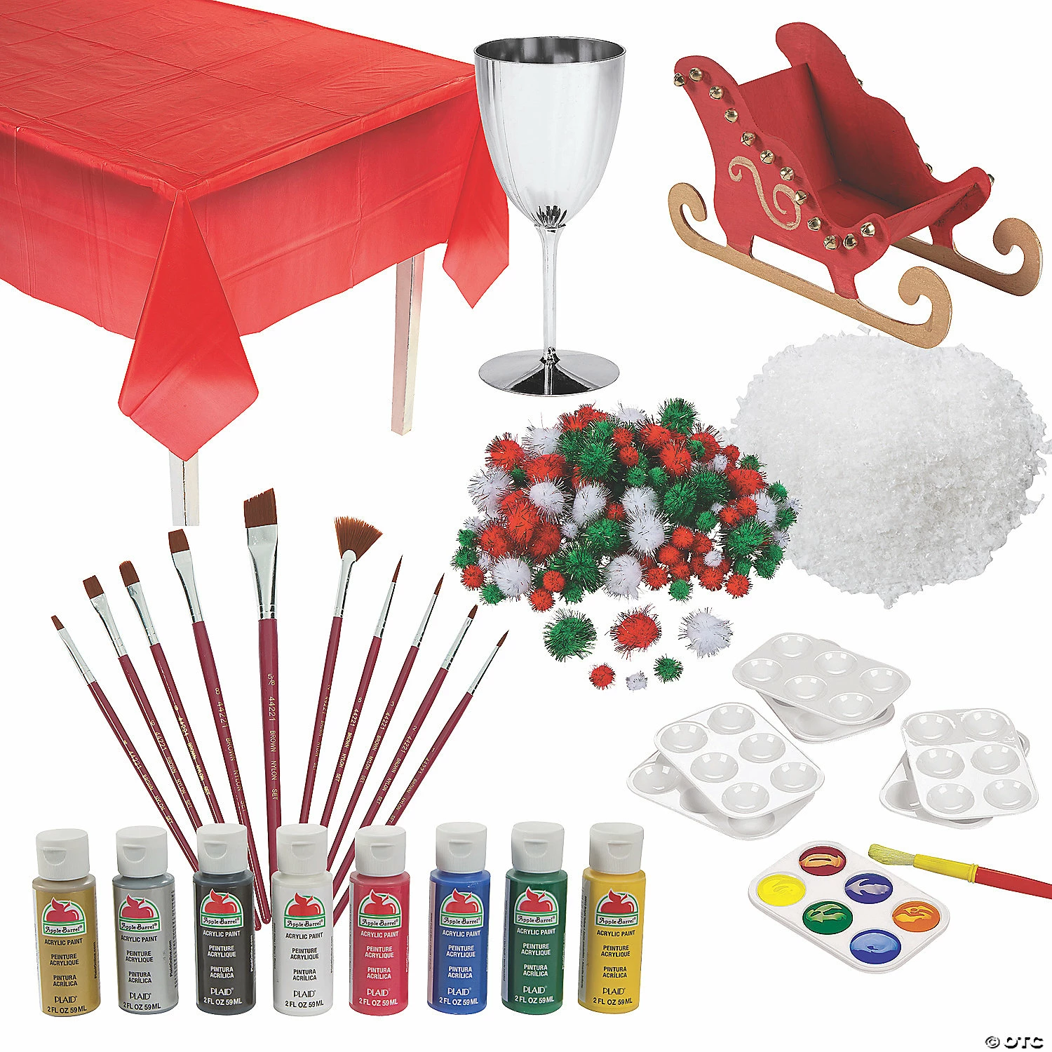 These sleighs will certainly spread some holiday cheer. And with all that wine, youโre going to need Santaโs reindeer to help steer! This fun DIY kit has everything you need and is great for holiday parties and adult craft night with family or friends. Decorate this cute sleigh with paint and other embellishments then place on a side table, mantel or anywhere throughout your home. This handmade Christmas decoration would also be a unique Christmas gift for someone special. (216 pcs. per unit) Assortment may vary.Includes: โข 8-Pc. Acrylic Primary Colors Paint Set (Includes 8 primary colors each in a 2 oz. plastic bottle. Safe and non-toxic. Conforms to ASTM D-4236.)โข 1 Plastic Craft Snow (Total wt., 3 oz.)โข 12 DIY Unfinished Wood Sleighs (8″ x 3 x 4 1/2″)โข 150 Acrylic Glitter Christmas Pom-Poms (1/2″ – 1″)โข 12 Plastic Rectangular Paint Palettes (Holds up to 6 colors in 1/2″ deep wells. 5 1/4″ x 3 3/4″)โข 20 Plaidยฎ Brown Nylon Paintbrushes (Includes 6 round brushes, 6 shader brushes, 2 angular shader brushes, 4 filbert brushes and 2 fan brushes. 6 7/8″ – 7 7/8″)โข 1 Plastic Red Tablecloth (Thin, slightly transparent. Disposable. 54″ x 108″)โข 12 Plastic Silver Metallic Wine Glasses (6 1/2″ 6 oz.)