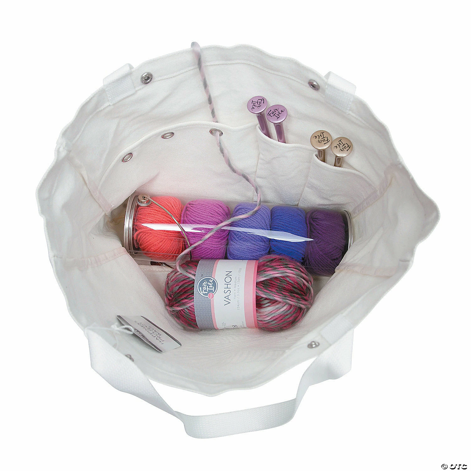 Take all of your knitting projects on the go in this cute tote bag! Designed to hold your yarn, needles and other knitting supplies, this canvas bag features a yarn heart with knitting needles — perfect for displaying to everyone around that you’re all about the knitting. This roomy bag has plenty of pockets inside and one with three “O” rings to feed your yarn through. 15″ x 4″ x 14″ with shoulder straps. © Fair Isle Yarn