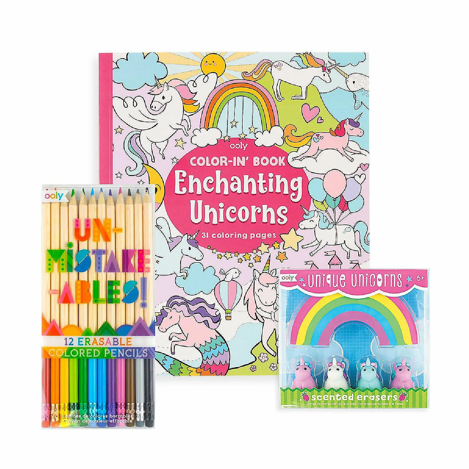 Delight the unicorn lover in your life with our Unique Unicorn Erasable Coloring Gift Pack. Includes coloring book, unicorn erasers and 12 colored pencils.