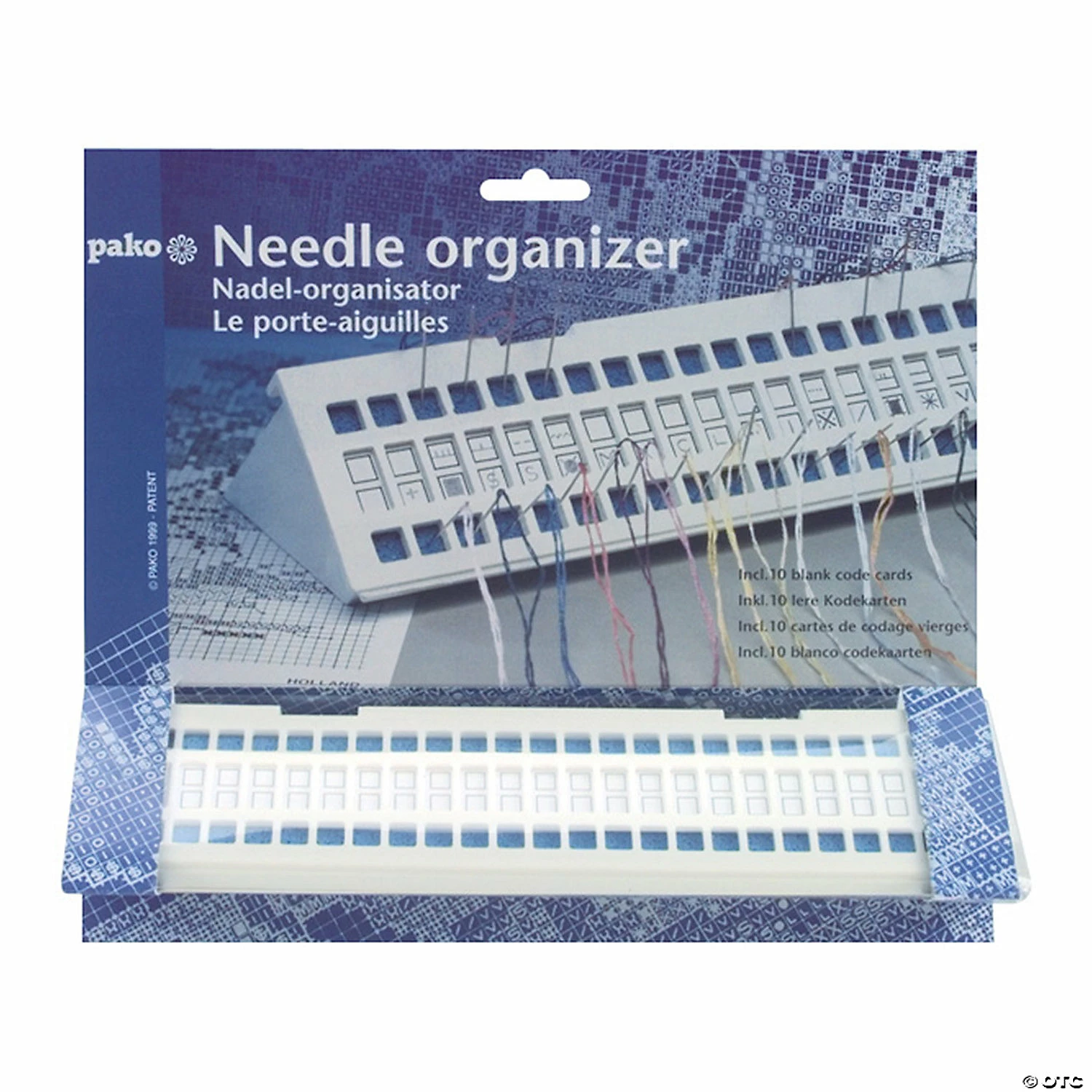 PAKO-Needle Organizer stays accessible without slipping and tangling because each is inserted into a foam-type pad. Central panel allows you to easily track fiber colors/numbers. Organizer sets at a 45 degree angle for easy visibility and includes 10 replacement color cards. Measures: 10 x 2.25 x 2.5 inches. Imported