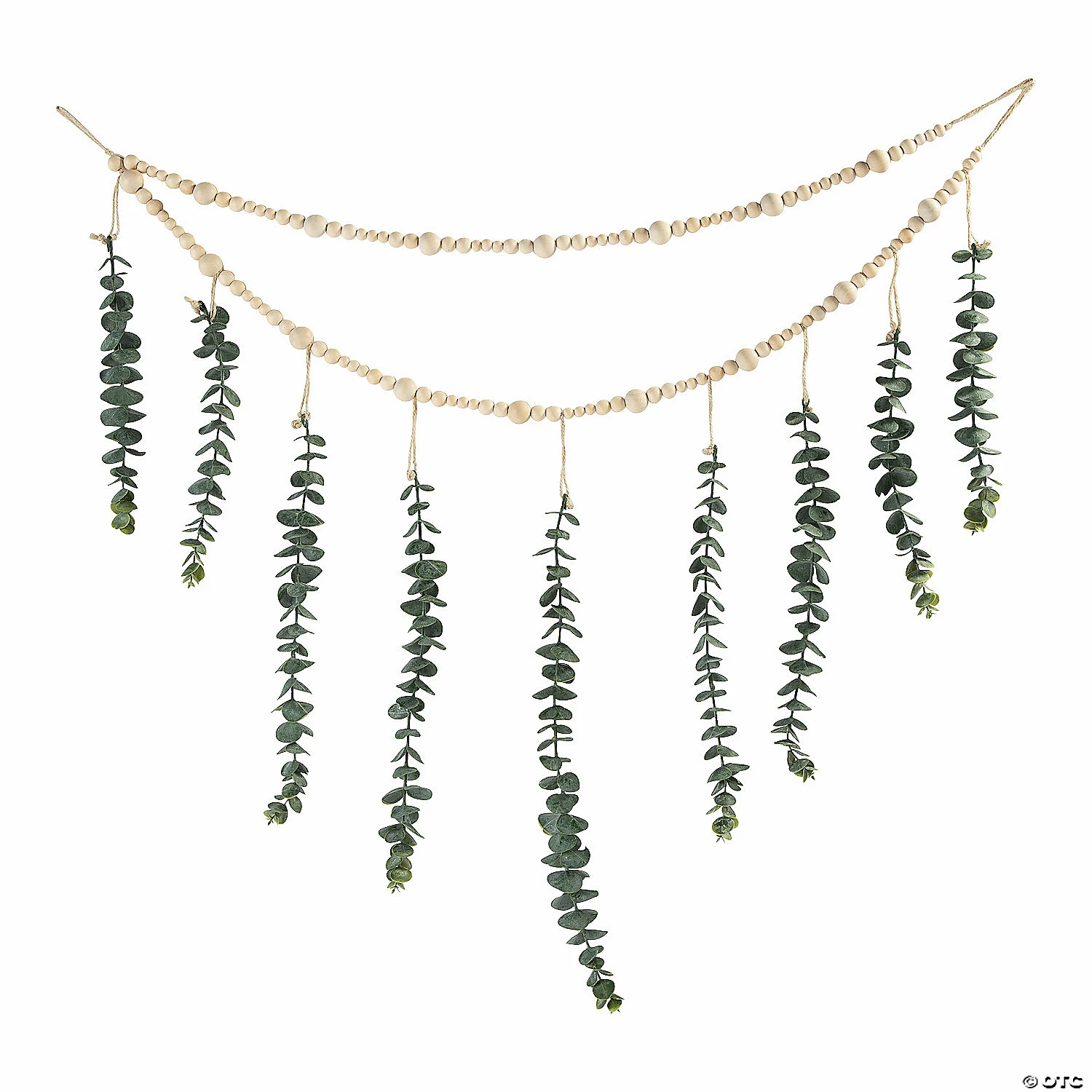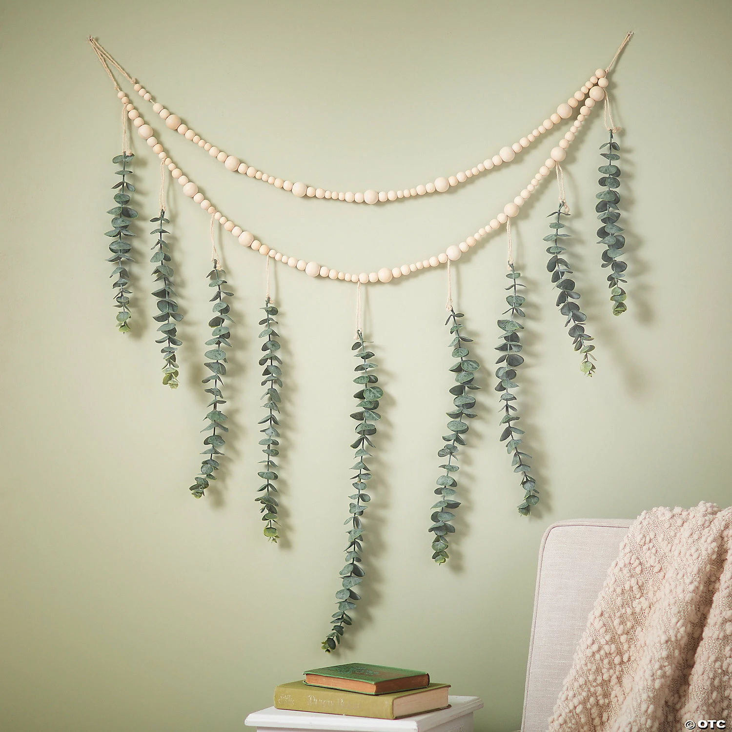Add a lovely decoration to home decor with this faux eucalyptus and wood bead garland that will grab attention while adding some greenery to your space. Give any wall space a fresh, natural look with these wooden beads and cascading faux eucalyptus leaves that wonโt wilt or brown with age. When rustic style meets modern looks, Positively Simple home dรฉcor emerges! Clean lines, natural elements and a neutral palette pair well with any color theme so you can make your home decorations both positively simple and uniquely yours. Plastic with wood beads. 33″ x 37″ ยฉ OTC