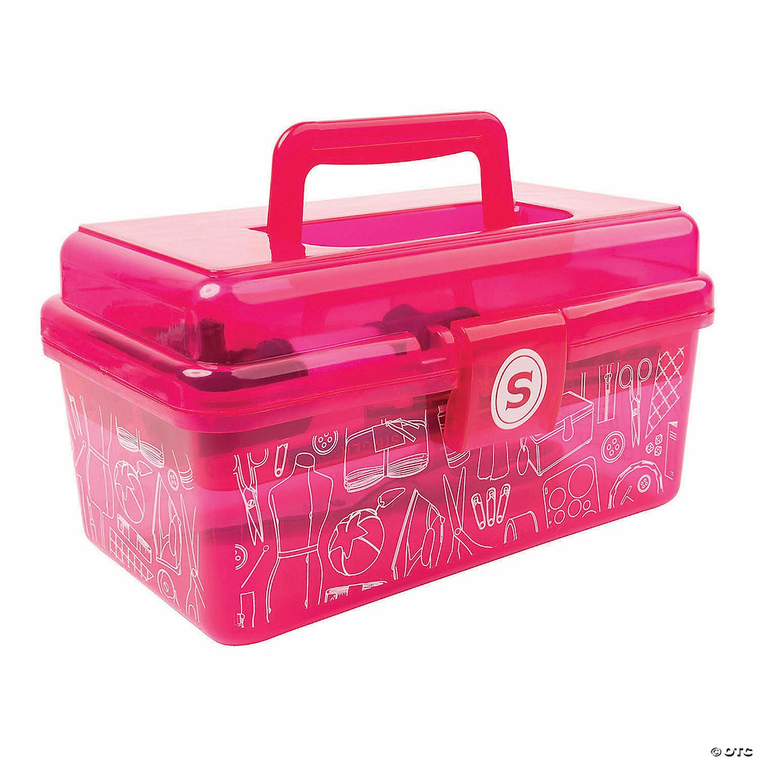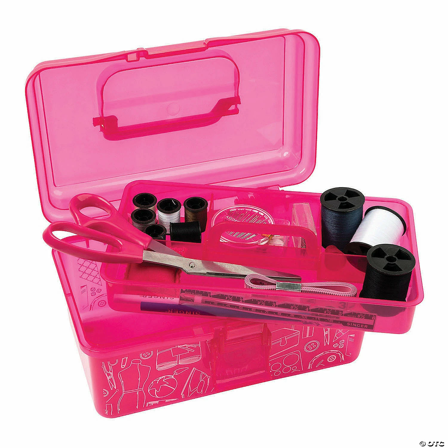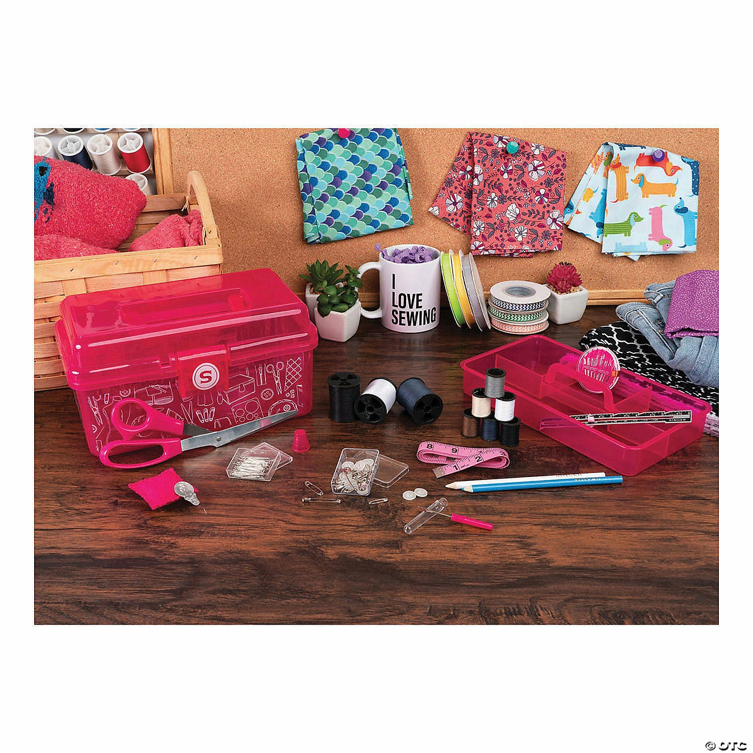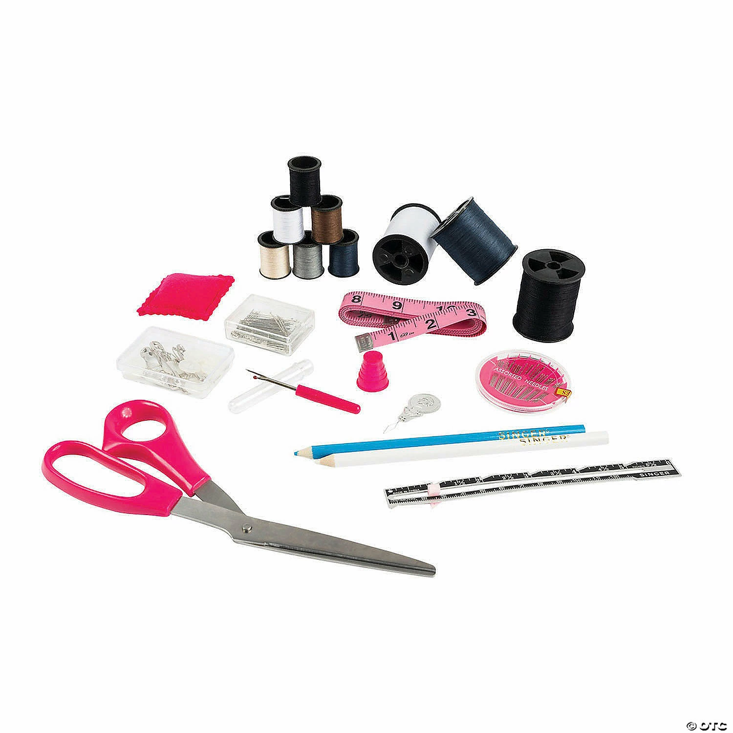 Everything you need to keep your sewing organized! 174 pieces come in a storage bin with lift out tray insert and a handle for easy transport. Includes 8.5in scissors, thimble, seam ripper, square pin cushion, 60in tape measure, 3 large thread spools (150yd each), 6 small thread spools (25yd each), 30 assorted hand needles in compact, needle threader, 100 dressmaker pins in case, 15 safety pins & 10 shirt buttons in case, seam gauge, and 2 fabric marking pencils.Includes 8.5in scissors, thimble, seam ripper, square pin cushion, 60in tape measure, 3 large thread spools (150yd each), 6 small thread spools (25yd each), 30 assorted hand needles in compact, needle threader, 100 dressmaker pins in case, 15 safety pins & 10 shirt buttons in case, seam gauge, and 2 fabric marking pencils.