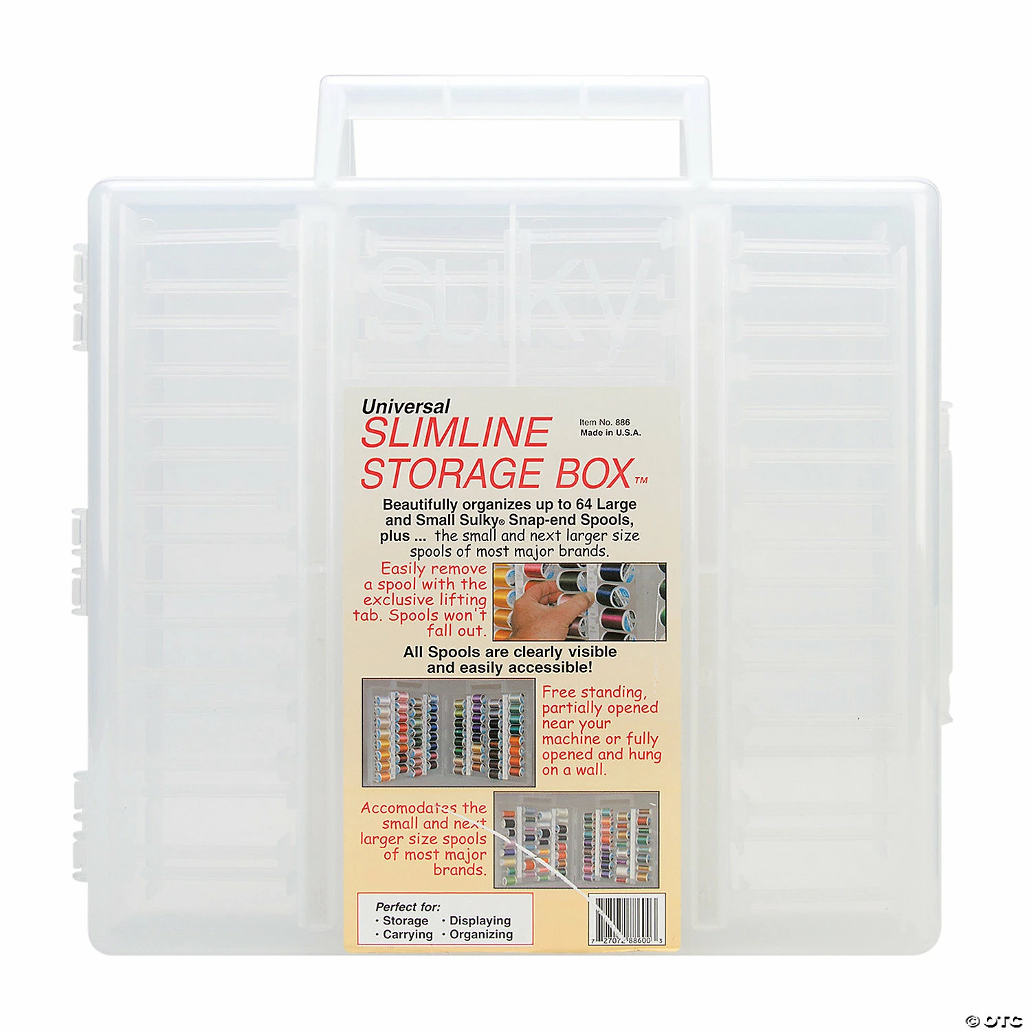SULKY-Universal Slimline Storage Box is perfect for all of your threads! Beautifully organizes up to 64 Large and Small Sulky Snap-End spools, plus the small and next larger size spools of most major brands. Use free-standing, partially opened near your machine, or fully opened and hung on a wall. Empty Storage Box is lightweight (only 6 pounds when filled), made of translucent plastic with a convenient carry handle. All spools are clearly visible and easily accessible, remove a spool with the exclusive lifting tab-spools will not fall out. Size: 15Hx15Wx3D when closed. Special Shipping Information: This item ships separately from other items in your order. This item cannot ship to a P.O. Box. This item may be subject to additional processing days. ITEM IS NOT ELIGIBLE FOR EXPEDITED SHIPPING