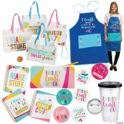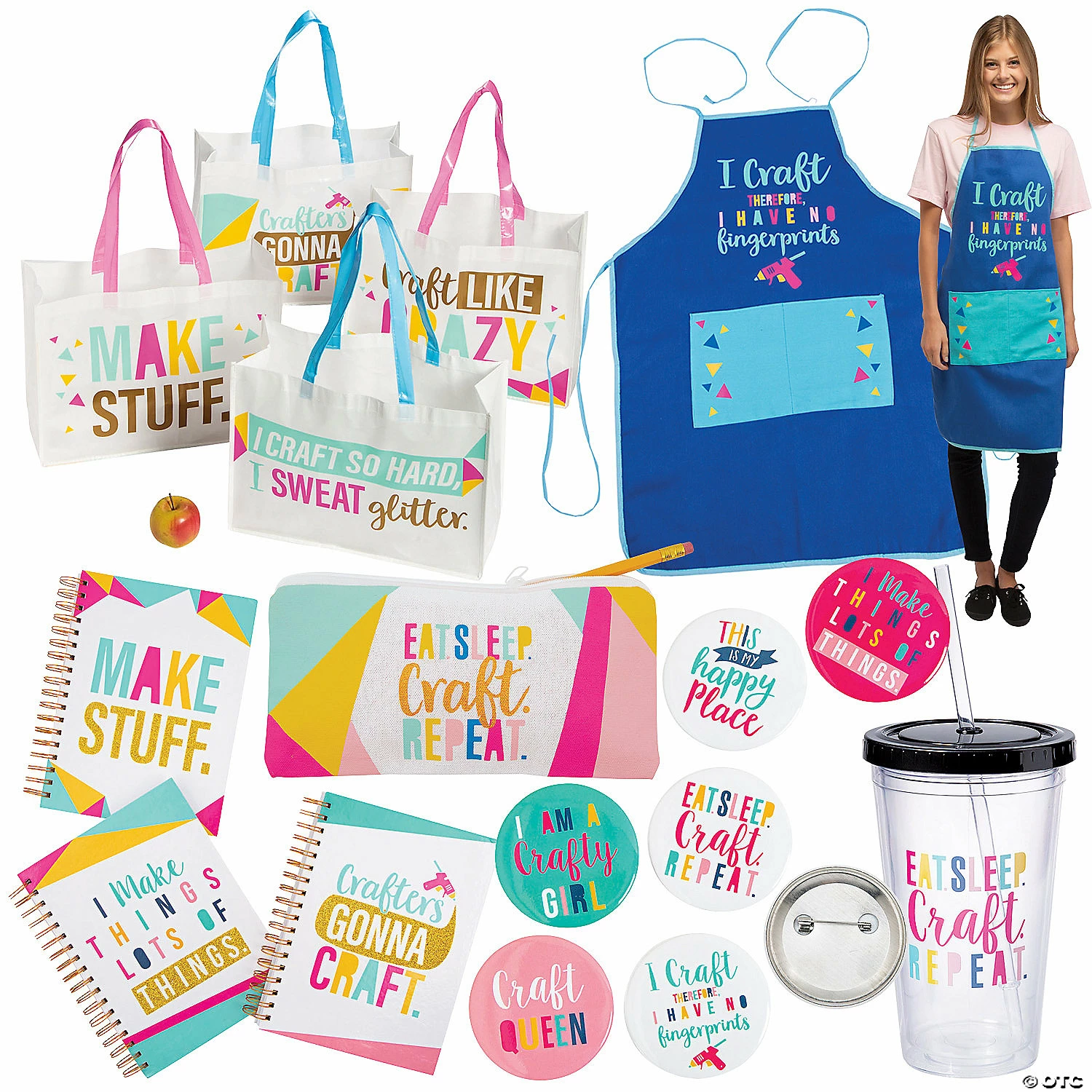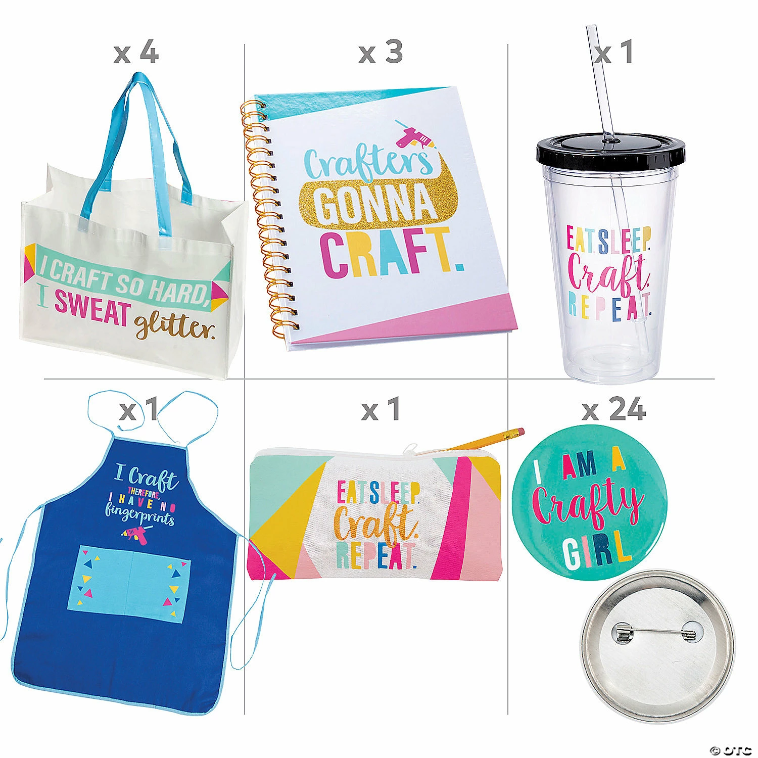 Love crafting? Show off your crafty personality with this fun kit that’s perfect for the craft enthusiast. Featuring plenty of crafting tools like a crafter’s apron, tote bags, and a crafter’s tumbler, this kit makes a fantastic gift for a person who loves crafting. Be sure to also check out all the fun and affordable craft supplies available here on this website. (34 pcs. per unit) Assortment may vary.Includes:• 1 Adult’s Crafty Canvas Apron (26″ x 34 1/4″ with 24″ neck ties, 33″ waist ties and a 14 1/4″ x 7 3/4″ pocket. Imported.)• 24 Metal Crafty Buttons (2″ diam.)• 1 Crafty Canvas Pencil Case (8 1/2″ x 4″ with a zipper closure.)• 3 Paper Crafty Spiral Notebooks (7″ x 9 1/2″ 80 blank pgs.)• 4 Nonwoven Polyester Large Crafty Laminated Tote Bags (7″ x 13″ with 11 1/2″ handles.)• 1 Plastic Crafty Tumbler with Lid & Straw (6″ 16 oz.)