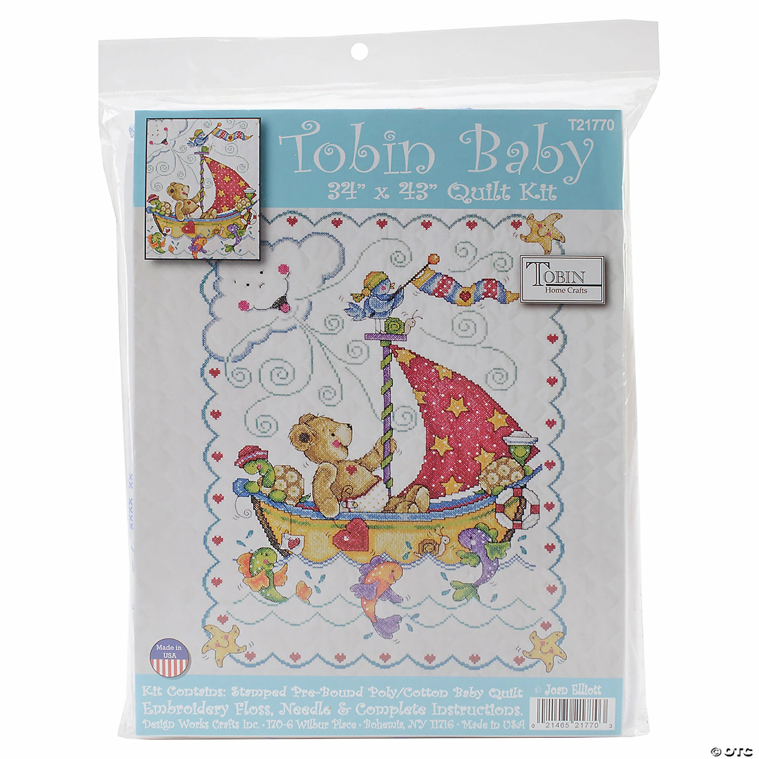 Tobin-Stamped Cross Stitch Kit. Beautiful designs and top quality materials make Tobin one of the top cross stitch kit makers worldwide. This package contains one stamped pre-bound baby quilt, embroidery floss, one needle and instructions. Design: Sail Away Baby Quilt. Finished size: 43×34 inches. Made in USA. Special Shipping Information: This item ships separately from other items in your order. This item cannot ship to a P.O. Box. This item may be subject to additional processing days. ITEM IS NOT ELIGIBLE FOR EXPEDITED SHIPPING